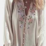 Fluida y sin esfuerzo chic, esta blusa de inspiración étnica presenta delicados bordados florales y un ajuste suelto y fresco. Hecha de 100% rayón, es ultraligera y perfecta para días de playa o salidas casuales de verano.