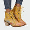 Botines de mujer con estampado oriental en tonos morado y dorado que destacan por su apariencia lujosa. La combinación de detalles bordados con cordones y tacón bajo ofrece estilo y comodidad, ideal para looks vanguardistas que no pasan desapercibidos.