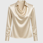 Confeccionada en tejido satinado de tacto suave, esta blusa ofrece una caída sofisticada con cuello doblado y detalle drapeado en el escote. Perfecta para crear looks elegantes y modernos, ya sea para el trabajo o para ocasiones especiales.