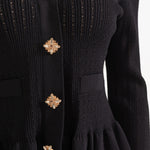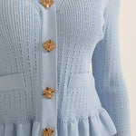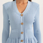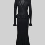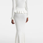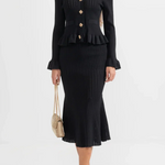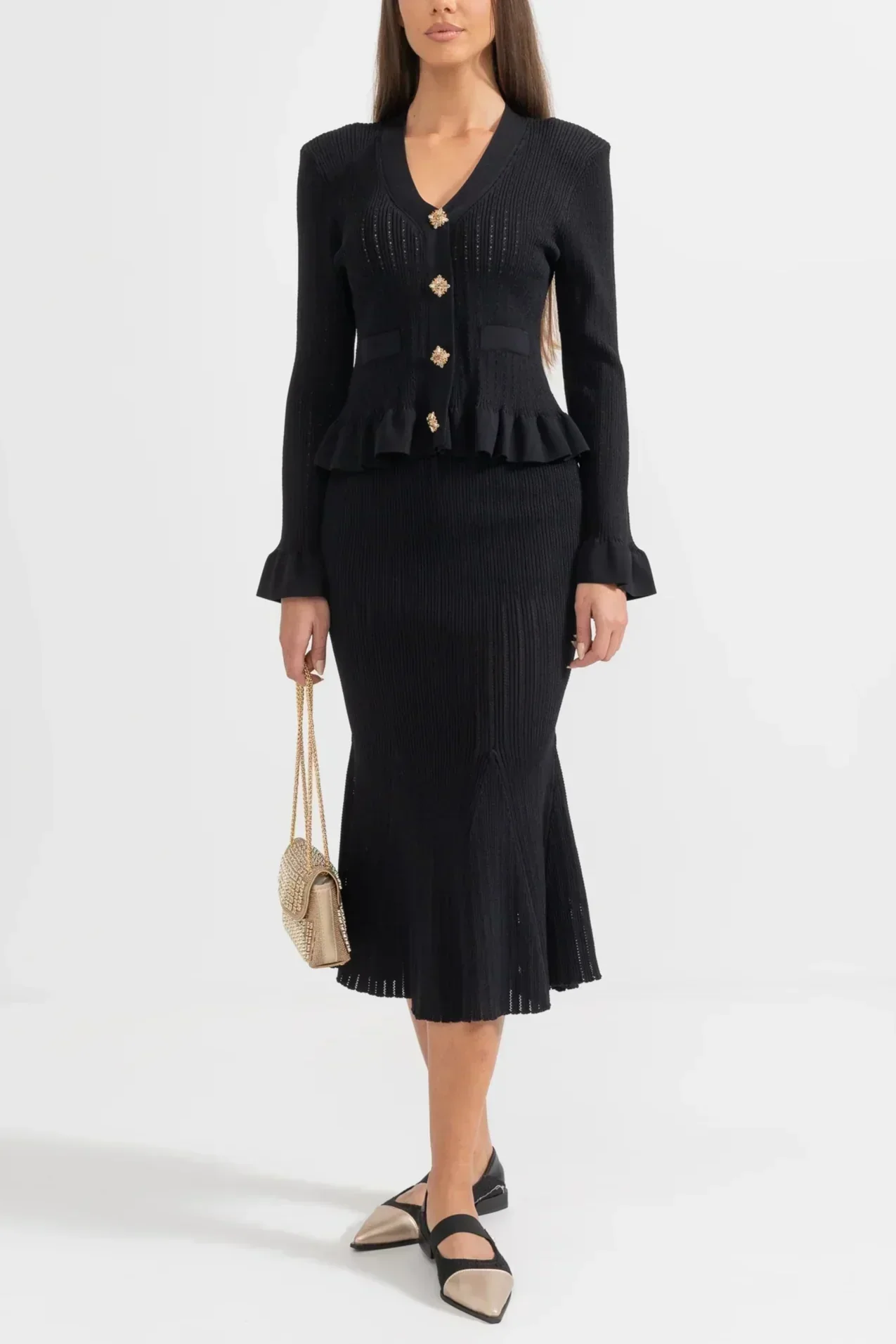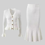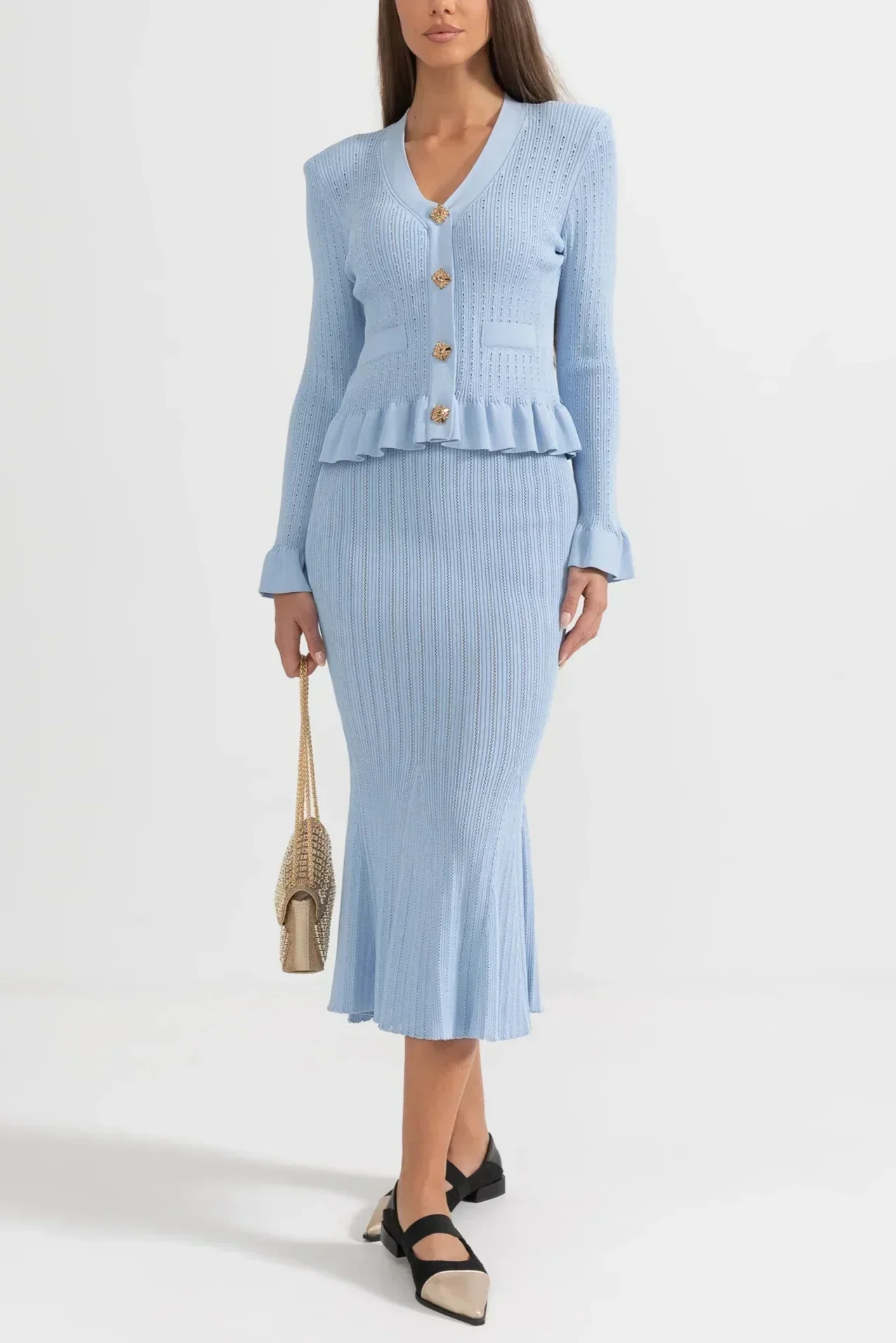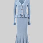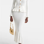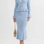 Un conjunto de punto que combina sofisticación y versatilidad en partes iguales. Prudence presenta un cárdigan ajustado con escote en V, delicados puños con volantes y botones de inspiración vintage, acompañado de una falda midi de talle alto y corte acampanado. Juntos crean una silueta fluida y elegante, perfecta para adaptarse a distintos momentos del día con estilo impecable.