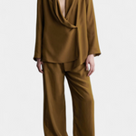 Un estilo que combina poder y elegancia con líneas pulidas. El conjunto Sue presenta un blazer estructurado con solapas de chal, cierre de botón y cinturón ajustable, acompañado de pantalones a juego para una silueta impecable. Diseñado en viscosa fluida, este look transmite seguridad y sofisticación sin esfuerzo.