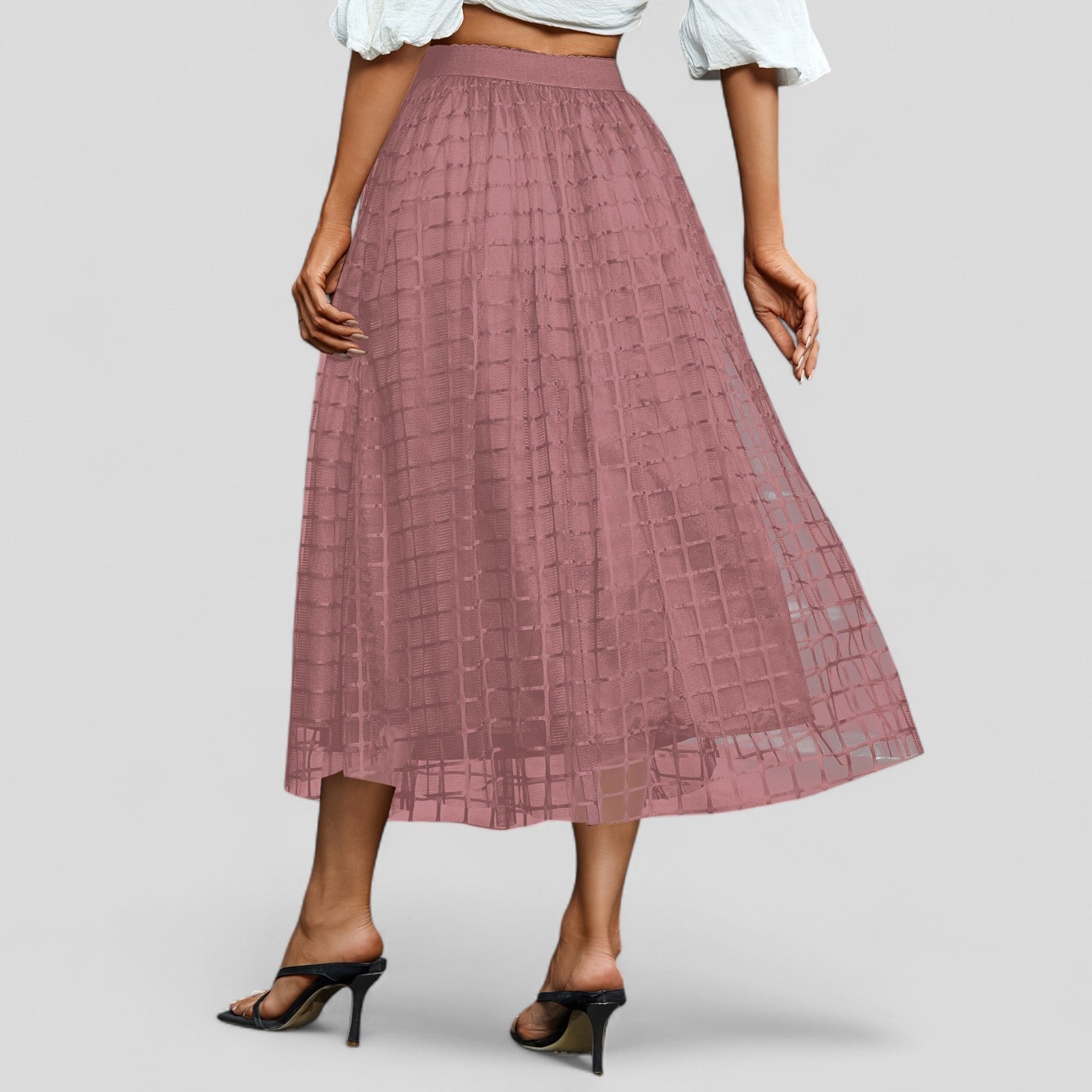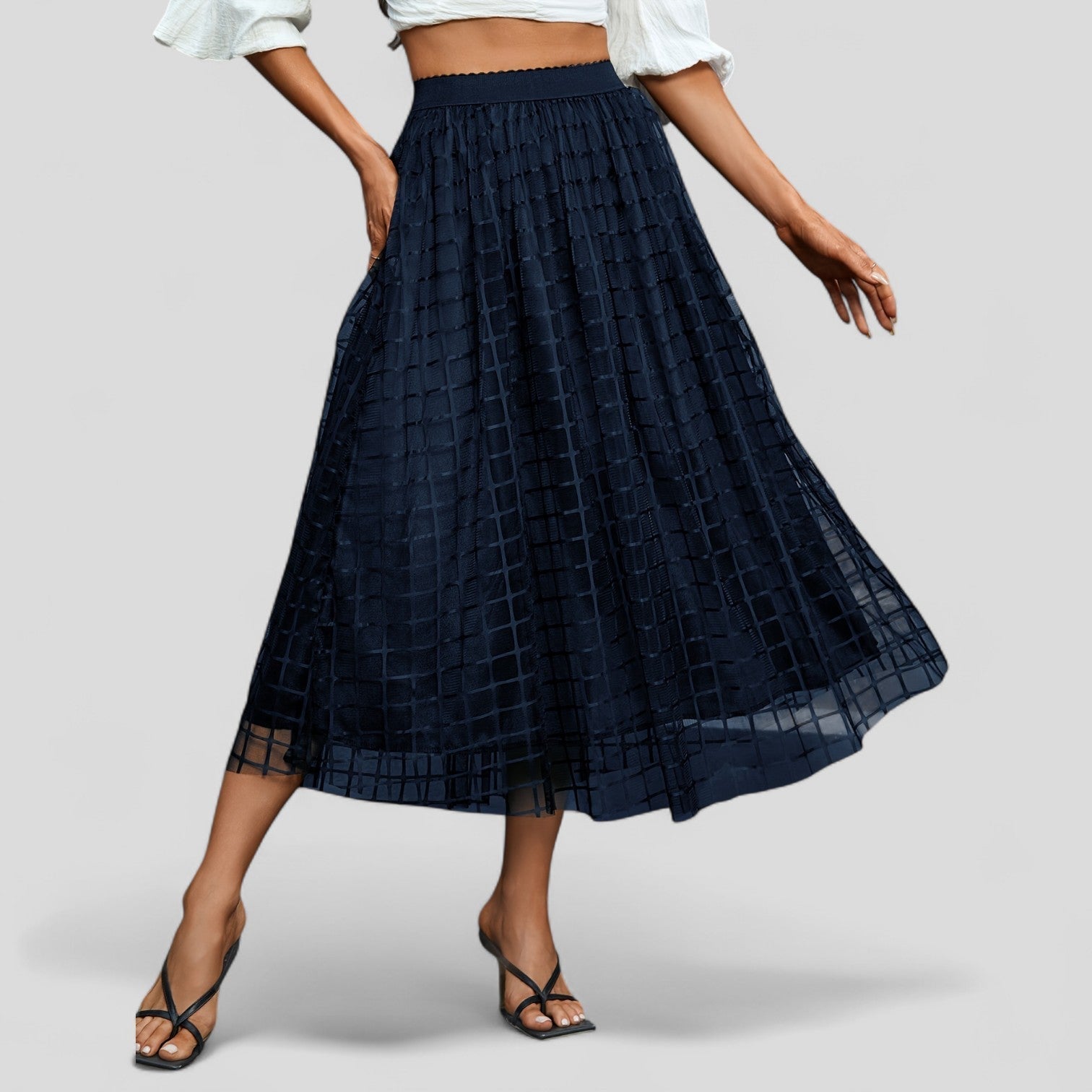 Una llamativa falda midi con material superior de malla transparente en un moderno diseño de rejilla. La elegante línea A proporciona una silueta femenina con mucho movimiento, mientras que el forro opaco ofrece una comodidad agradable al llevarla.