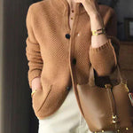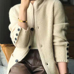 La Claire – Cárdigan de mezcla de lana con botones combina la elegancia clásica con la versatilidad moderna. Confeccionada en una mezcla de cachemir de alta calidad, ofrece una sensación suave y agradable al tacto, equilibrando perfectamente calidez y ligereza. Su corte recto y el delicado tejido hacen que sea ideal tanto para looks de oficina como para outfits casuales del día a día. Ya sea sobre una blusa para ir al trabajo o combinada con jeans y botines, esta chaqueta de punto aporta un toque femenino a cualquier estilo y garantiza que siempre luzcas segura y refinada.