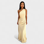 El vestido Aurelia es puro lujo en movimiento. Con su escote asimétrico, tejido satinado y drapeado envolvente, es la elección perfecta para brillar en ocasiones especiales sin renunciar a la comodidad.