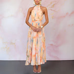 Con un encanto que no pasa desapercibido, el vestido Aurora combina elegancia, frescura y sensualidad en la medida perfecta. El escote halter realza el escote con sofisticación, mientras la espalda abierta crea un look atrevido e irresistible. La cintura ajustada moldea suavemente la silueta, y la falda maxi fluida acompaña tus movimientos con ligereza y romanticismo. Ideal para bodas en la playa, cenas al atardecer o ese evento especial de verano.