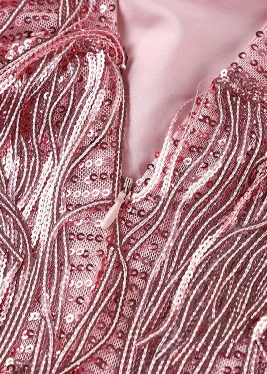 El corte ajustado con tirantes finos realza la silueta femenina, mientras que las capas de lentejuelas reflejan la luz con cada movimiento. Un vestido hecho para ser notado.