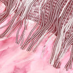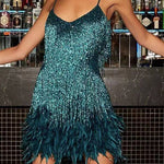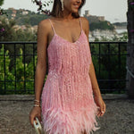 El acabado con plumas en el bajo aporta un toque de extravagancia que eleva el look y te hace destacar con elegancia — sin excesos, pero con actitud.