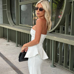 El top palabra de honor peplum resalta la cintura, mientras que la falda recta alarga la figura con sofisticación.