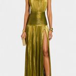 Atrevido y sofisticado, Emma - Elegancia Nocturna cautiva con su tono metálico de peridoto y su silueta fluida. Diseñado para noches que merecen ser inolvidables, este vestido combina un escote halter esculpido, espalda descubierta y una abertura alta que acompaña cada paso con magnetismo.
