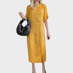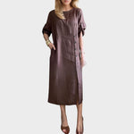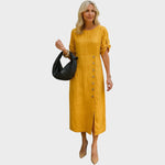 Con el vestido Adélia, cada paso se caracteriza por la ligereza y la elegancia. Confeccionado en una mezcla de lino, algodón y poliéster, ofrece frescura, comodidad y un toque sofisticado. Su diseño minimalista se realza con botones laterales, una sutil abertura y medias mangas ajustables, creando un look moderno y versátil que se adapta a cualquier ocasión. Además, cuenta con prácticos bolsillos y está disponible en varios colores pastel suaves, perfecto para un look refinado y atemporal.