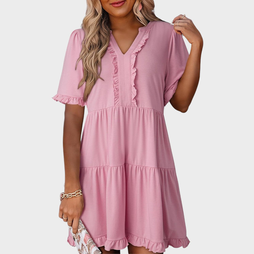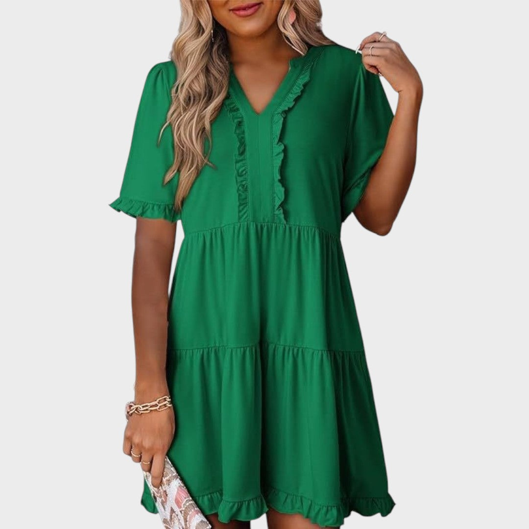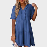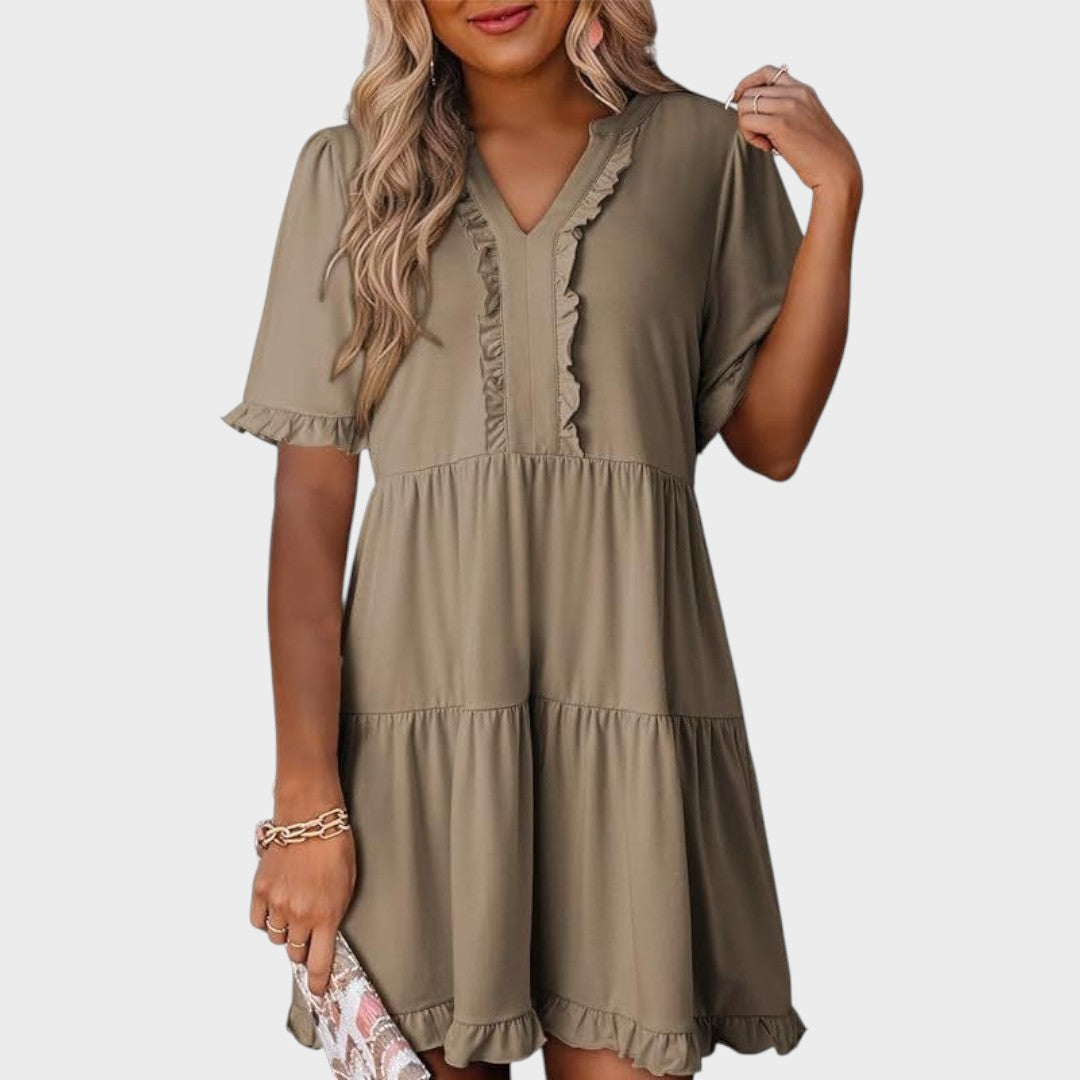 Te presentamos el vestido corto informal Barbara con cuello en V. Este vestido combina comodidad con versatilidad chic, por lo que es la elección perfecta para cualquier ocasión, desde un brunch con amigos hasta una salida nocturna.