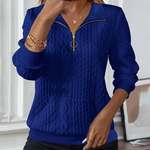 Descubre la sudadera Paige, diseñada para brindarte calidez, comodidad y una silueta favorecedora, todo en uno. Su suave tejido de punto trenzado y su elegante media cremallera crean un look sofisticado, mientras que su corte relajado se adapta suavemente al abdomen y los brazos para un efecto estilizador sin abultar.