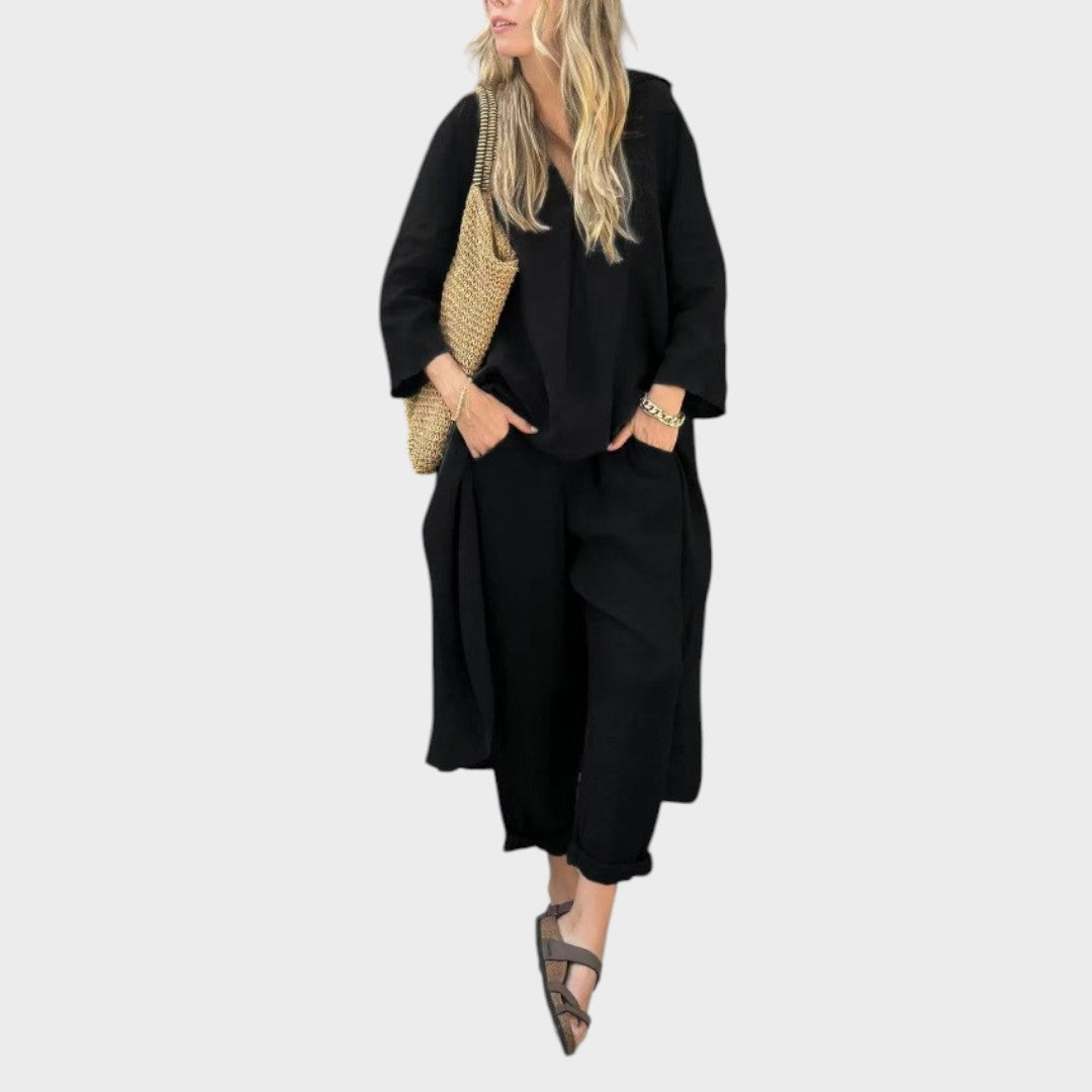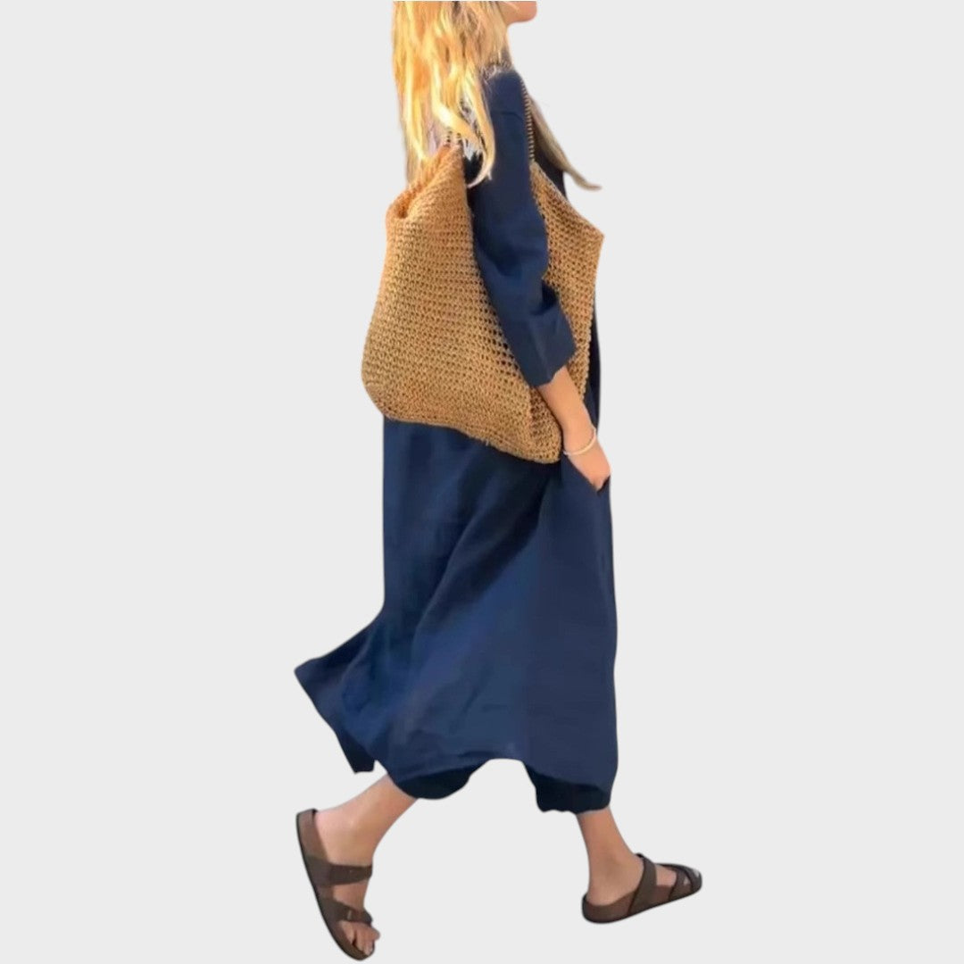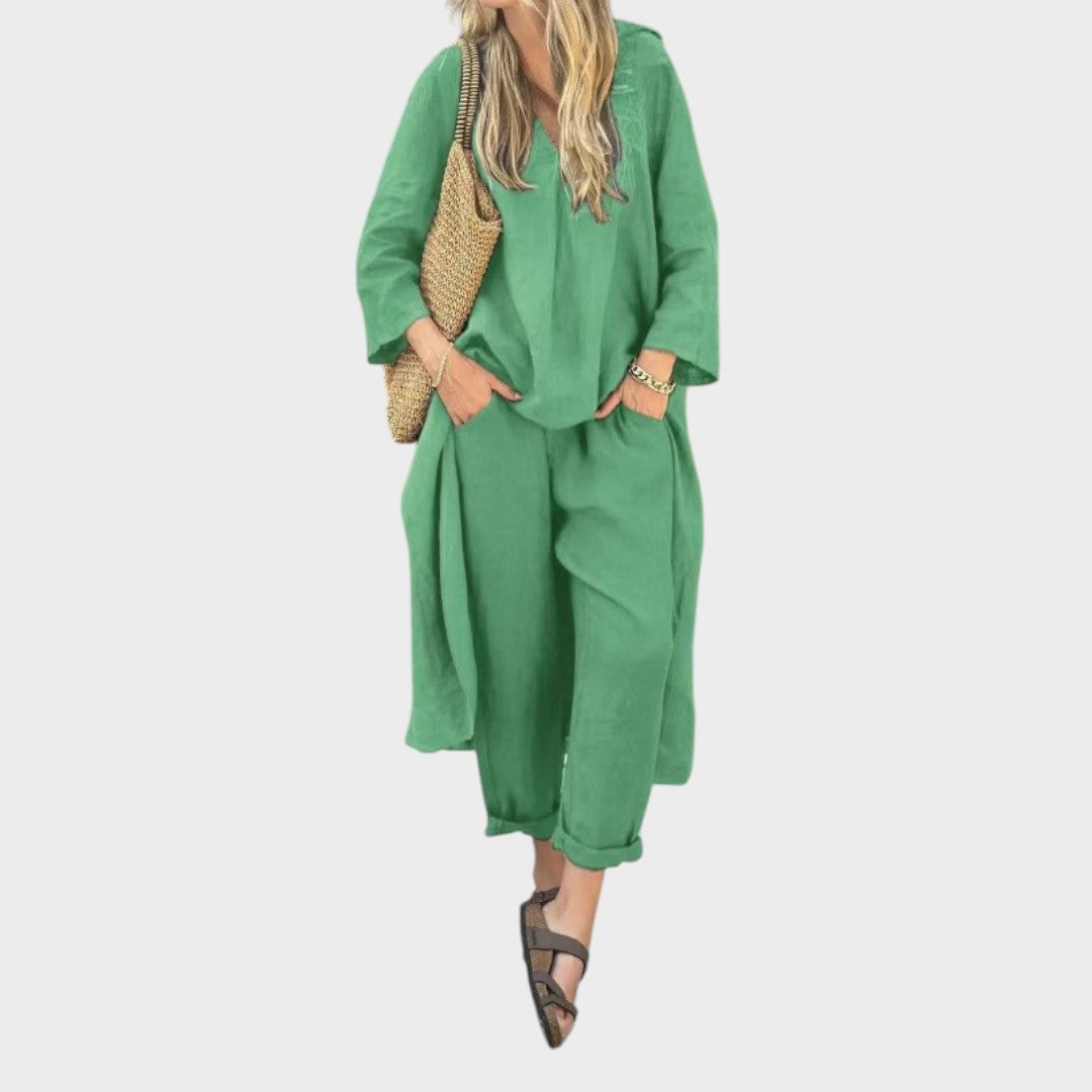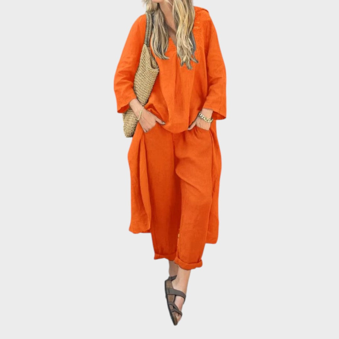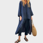 Ya sea para mañanas frescas o paseos en la hora dorada, este vibrante conjunto está hecho para seguir el ritmo. El top holgado de cuello en V y los pantalones anchos combinan la transpirabilidad del algodón y el cáñamo con la fluidez, ofreciendo estilo y comodidad durante todo el día en una silueta llamativa.